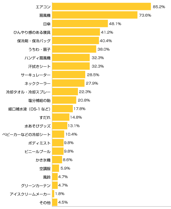 こういった室内の備えの一方、屋外での備えとしては、直射日光や紫外線をカットしてくれる「日傘」を準備されている方がトップに。